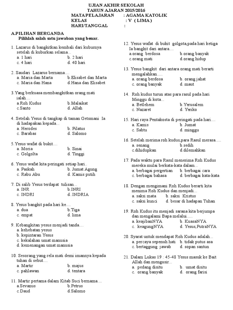 Artikel ini bertujuan untuk memberikan gambaran komprehensif mengenai contoh-contoh soal Pendidikan Agama Kristen kelas 9 semester 2. Contoh soal ini dirancang untuk mengukur berbagai tingkat pemahaman, mulai dari pengetahuan dasar hingga kemampuan analisis dan aplikasi. Dengan memahami struktur dan jenis soal ini, siswa diharapkan dapat mempersiapkan diri dengan lebih baik, sementara guru dapat menemukan inspirasi dalam menyusun instrumen evaluasi yang efektif dan relevan.